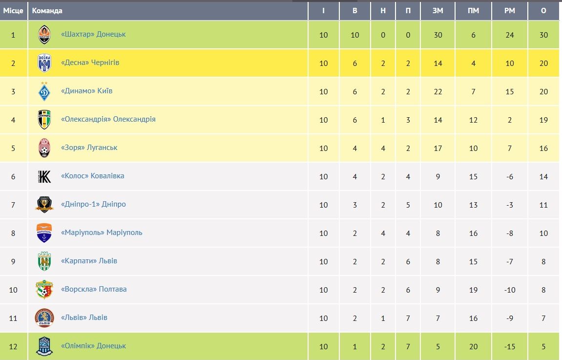Турнирная таблица чемпионата Украины после 10-ти туров