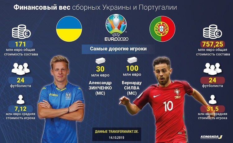 По данным transfermarkt.de, состав сборной Португалии стоит дороже состава сборной Украины почти на 600 млн евро, пишет zbirna.com.