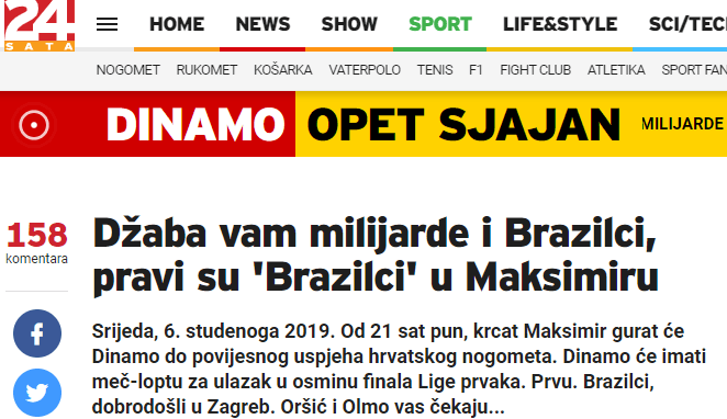 Удивительно, но один из лучших бомбардиров Лиги чемпионов играет в Загребе, после 3-х туров у "Динамо" 4 очка, а возможность выйти в плей-офф фактически гарантирована, осталось просто выиграть у "Шахтёра" на домашнем стадионе. В среду, 6-го ноября, переполненный "Максимир" подтолкнёт "Динамо" к историческому успеху хорватского футбола. Бразильцы, добро пожаловать в Загреб. Оршич и Ольмо ждут вас…".