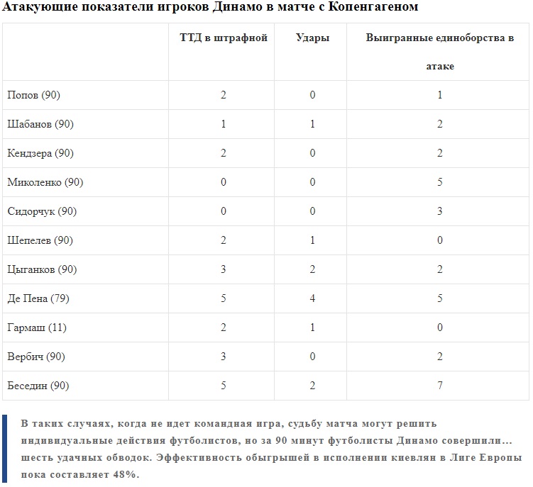 Динамо провело очередной безликий матч в Лиге Европы, показав не самую убедительную игру в первую очередь в атаке, пишет zbirna.com. У команды Алексея Михайличенко, показалось, отсутствовал запасной вариант — все карты спутал быстрый гол Копенгагена. Киевлянам явно не хватало последнего паса, но все это происходило потому, что не было толкового начала атак от защитников. Слишком медленно двигался мяч — и двигался он по таким траекториям, которые позволяли сопернику быстро закрывать все опасные зоны. При всем преимуществе бело-синих датчане чаще доставляли мяч в штрафную площадь и сделали там больше полезных ТТД, чем динамовцы, выглядевшие боевито в обороне, но на редкость не организованно в атаке. Туманной, словом, получилась игра…
