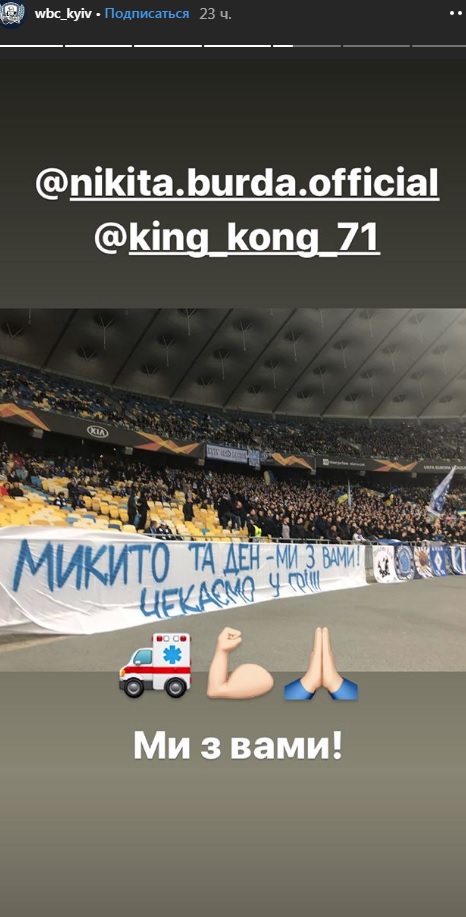 Ультрас "Динамо" поддержали травмированных игроков команды Никиту Бурду и Дениса Бойко. На матч с "Копенгагеном" болельщики вывесили специальный баннер, посвященный игрокам.