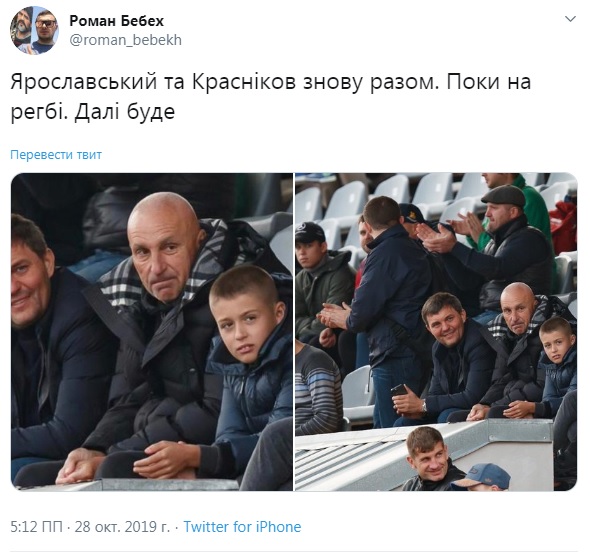 Вице-президент "Динамо" Евгений Красников в компании бывшего владельца харьковского "Металлиста" Александра Ярославского побывал на регби. Об этом на своей странице в Твиттере сообщил журналист Роман Бебех.