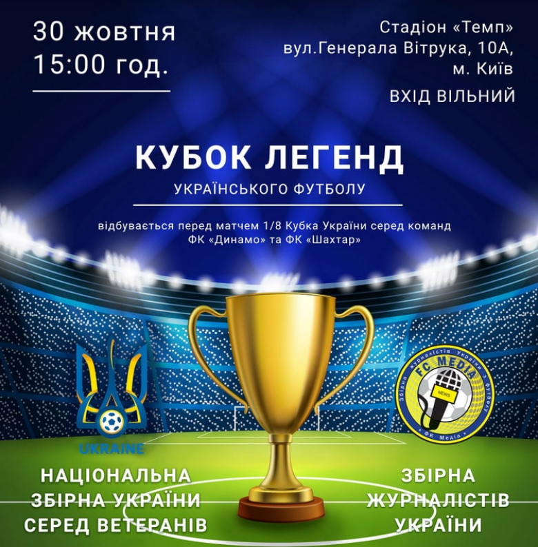 30 жовтня о 15.00 у Києві на стадіоні «Темп» розпочнеться товариський футбольний матч «Кубок легенд українського футболу» між збірною України серед ветеранів та збірною журналістів України.