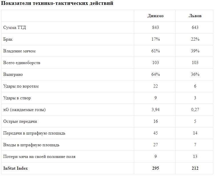 Самым полезным игроком поединка Динамо — Львов стал защитник сборной Украины Александр Караваев. Рейтинг эффективности его игры, InStat Index, составил 347 баллов. Больше всего ТТД — у Николая Шапаренко (110), выигранных единоборств — у того же Караваева (14), передач в штрафную площадь — у Виктора Цыганкова (11), ударов по воротам — у Шапаренко (четыре), отборов — у Дениса Гармаша (10), перехватов — у Виталия Миколенко (пять), подборов — у Дениса Попова (девять).
