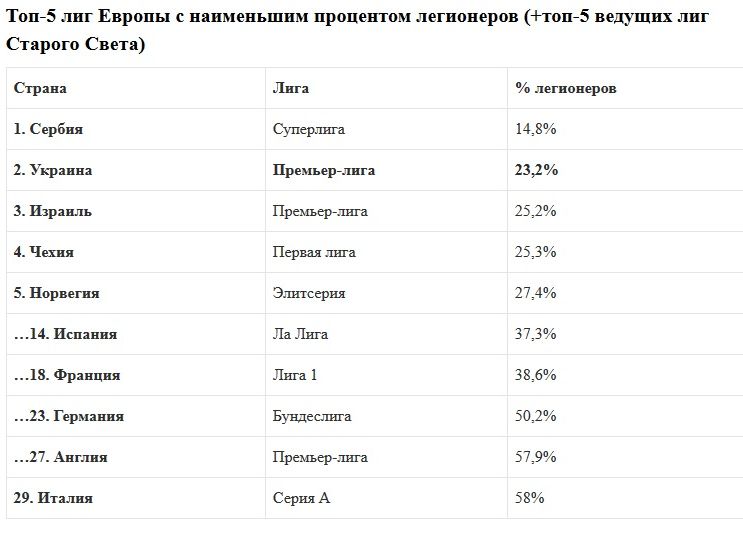 Спецы провели анализ 31-й европейской лиги и выяснили, что наименьшее количество легионеров сейчас выступает в сербском высшем дивизионе. На втором месте в этом рейтинге — украинская Премьер-лига. Замкнул призовую тройку элитный дивизион чемпионата Израиля.