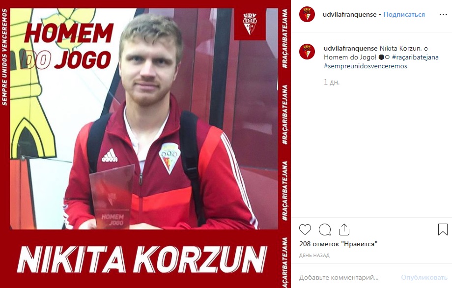 Как сообщает официальная страница португальского клуба «Вилафранкенсе» в Инстаграме, полузащитник Никита Корзун, арендованный у «Динамо», стал игроком матча против клуба «Академика Визеу».