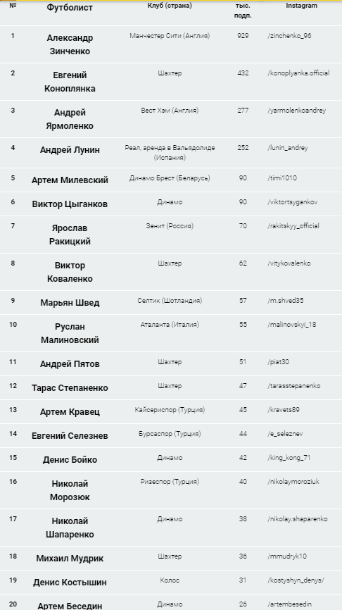 Рейтинг украинских футболистов в Instagram: