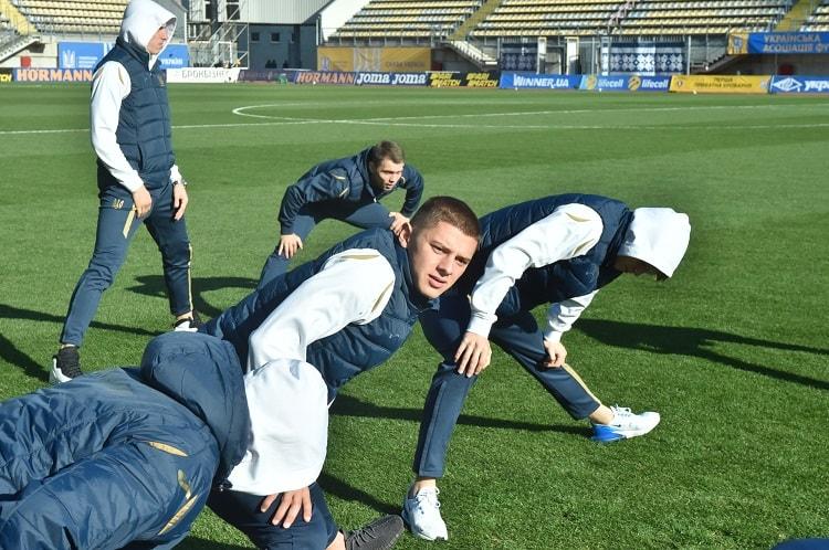Сьогоднішня традиційна передматчева прогулянка збірної України видалася дещо незвичайною. Під час неї команда прибула на «Славутич-Арену». Футболісти походили газоном та залишилися задоволені його станом. Потім під керівництвом тренера з фізпідготовки Івана Баштового вони провели невеличку розминку.