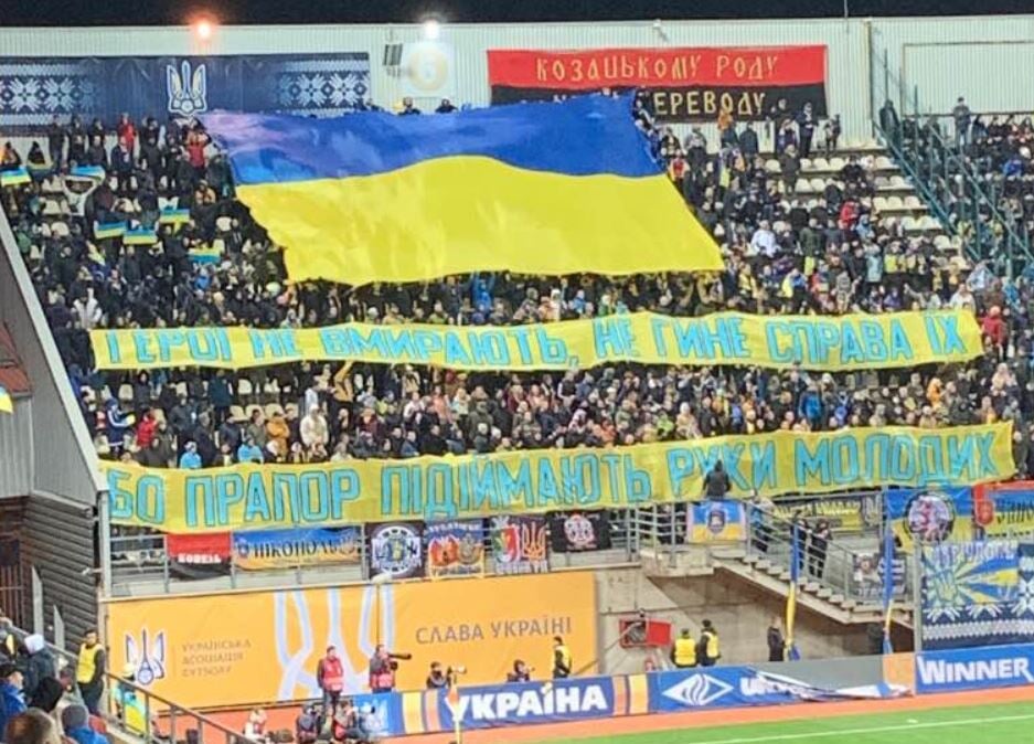 Фанаты вывесили баннер "Герої не вмирають, не гине справа їх, бо прапор підіймають руки молодих" на матче Украина – Эстония