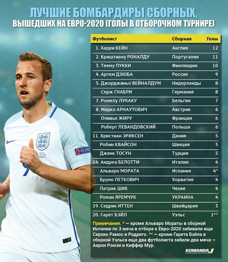 Лучшим бомбардиров отборочного турнира Евро-2020 стал нападающий сборной Англии Харри Кейн. Криштиану Роналду — второй, пишет zbirna.com.