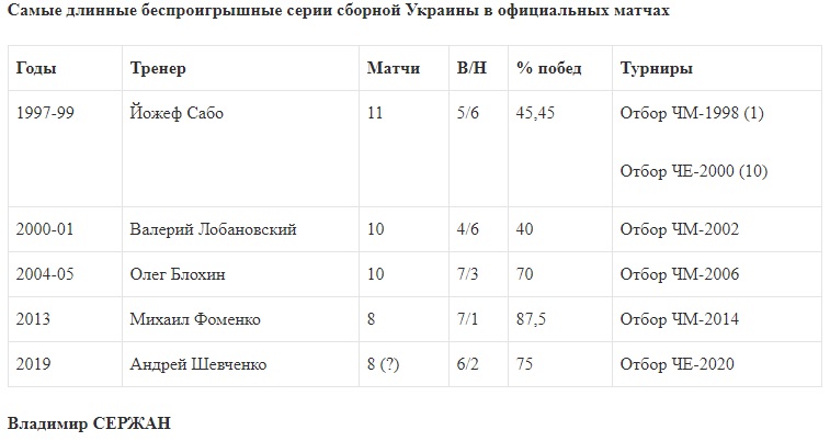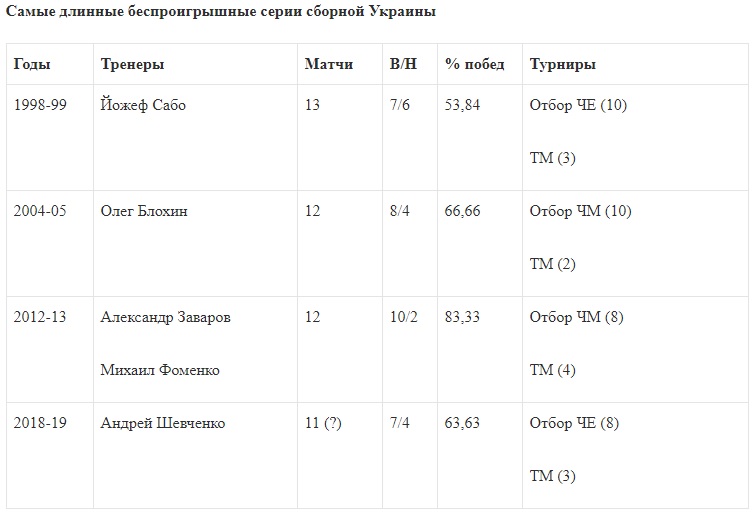 По 10 поединков подряд сборная не проигрывала при Валерии Лобановском и Блохине. При Фоменко был аналогичный результат с тем, что сейчас у Шевы. По проценту побед команда Андрея Николаевича уступает только предыдущей серии, случившейся в 2013-м.