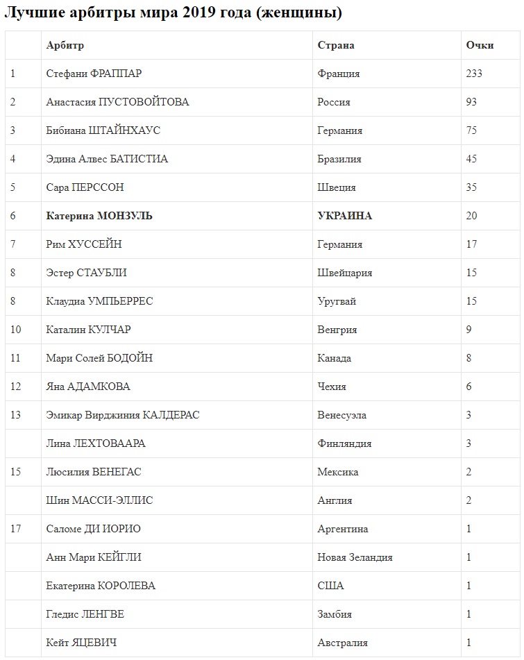 И самый главный украинский интерес в судейском вопросе уже не первый год — в позиции Катерины Монзуль. Представительница Харькова стабильно находится в мировой элите. В 2015 году она выиграла опрос IFFHS. В 2014-м была второй, в 2017-м — четвертой, в 2018-м — пятой. На этот раз Монзуль отступила еще на один шаг назад — шестое место.