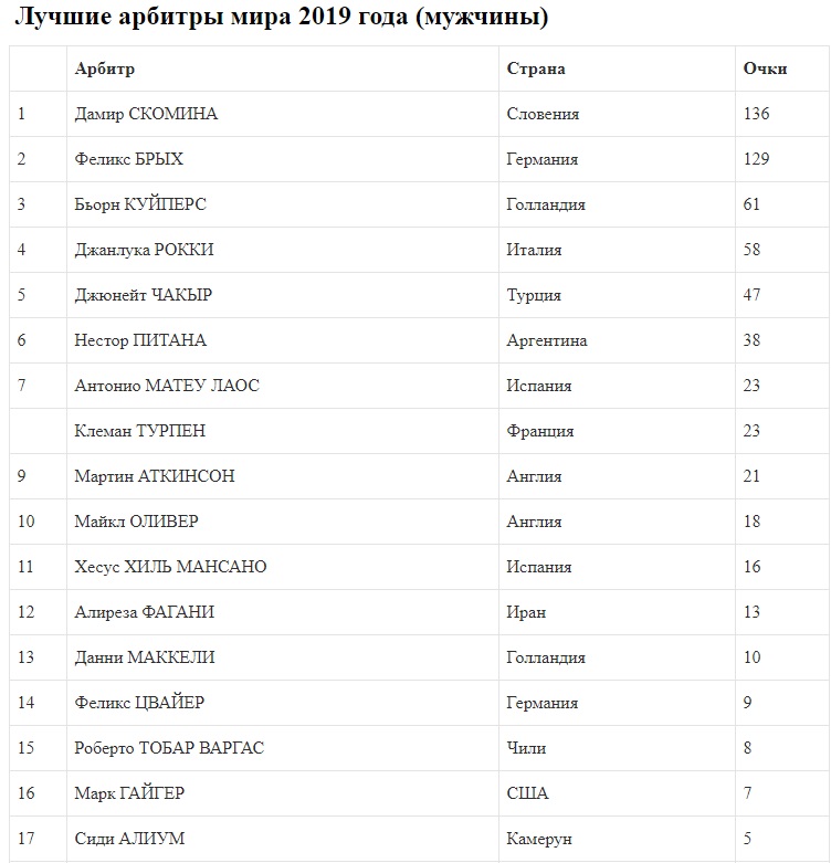 Лучшим арбитром мира среди мужчин был признана Дамир Скомина из Словении. В 2019 году он отработал на финале Лиги чемпионов между Ливерпулем и Тоттенхэмом. Вообще на международной арене он работает с 2003 года. С тех пор провел более 120 поединков под эгидой УЕФА и ФИФА.