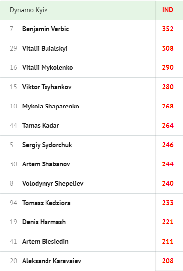В топ-3 лучших игроков киевлян также вошли полузащитник Виталий Буяльский (2 ассиста, 308 баллов) и защитник Виталий Миколенко (1 гол, 290 баллов).
