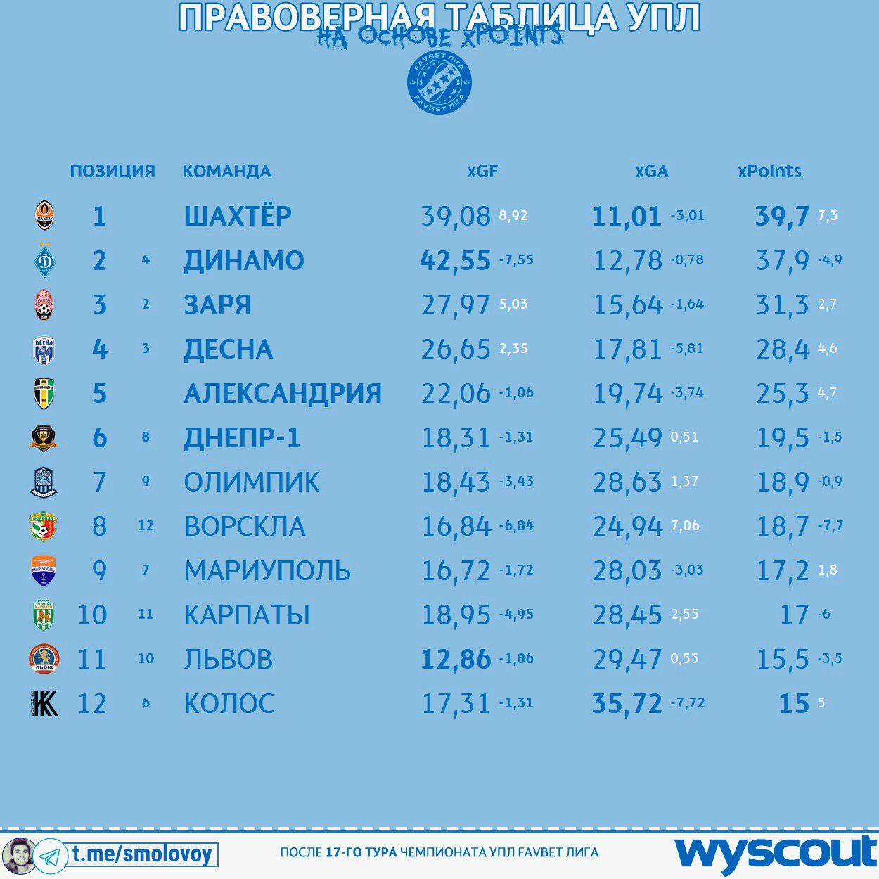 Блогер Михаил Смоловой в своем Telegram-канале анализирует ситуацию в турнирной таблице чемпионата Украины по ожидаемым набранным очкам после 17-го тура.