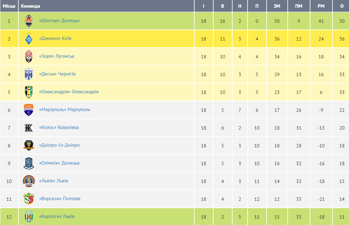 Турнирная таблица Премьер-лиги после 18-ти туров. "Динамо" будет зимовать на втором месте
