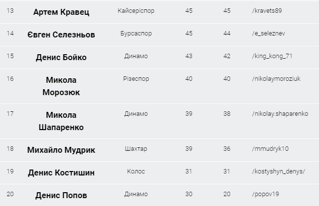 У нашому рейтингу ТОП-20 найпопулярніших українських футболістів рівно половина грає в нашій Прем'єр-лізі: п'ять представників Шахтаря, чотири гравці Динамо і один - Колоса. Ще десять футболістів грають за кордоном.