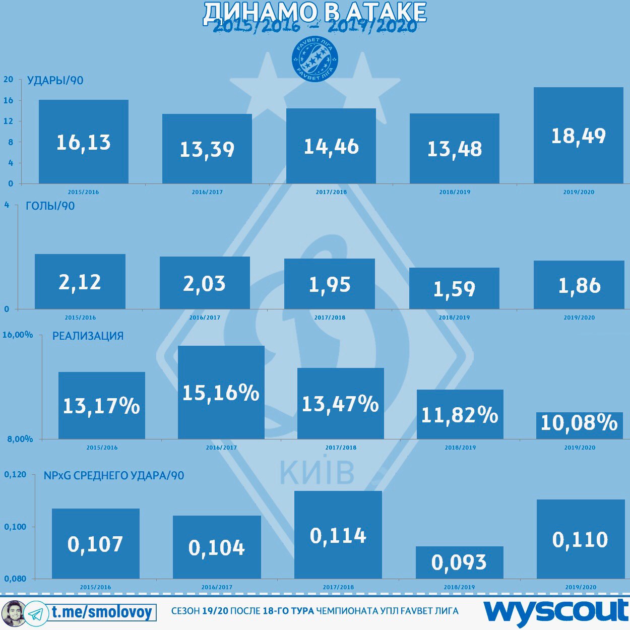 Итак, сходу смотрим на третью строчку столбиков - на процент реализации. В нынешнем сезоне Динамо забивает только каждым десятым ударом (10.08%). Показатель наименьший за последние пять розыгрышей УПЛ. Исключил из выборки поединки еврокубков, чтобы не заплакать.