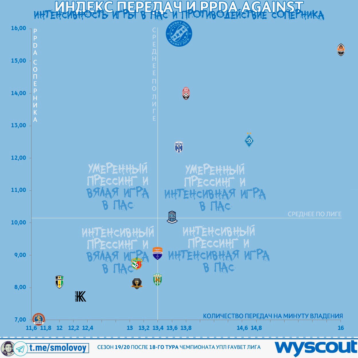 Ожидаемо особняком стоит Шахтёр, который двигает мяч с наивысшей интенсивностью (16 передач на минуту владения), но и сталкивается с наиболее слабым прессингом (15.33 PPDA против).