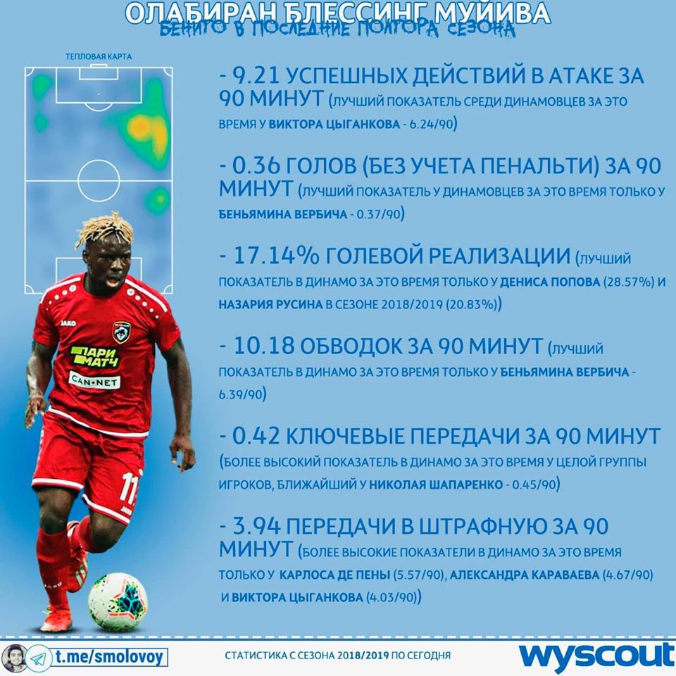 Но если уругваец провёл на поле 2361 минуту игрового времени, то у нигерийца в базе Wyscout за Тамбов всего 1506. Простое деление этой цифры на 95 даёт ~16 полных матчей.