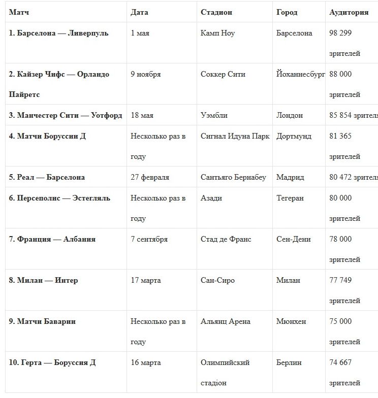 Авторитетный портал transfermarkt.de составил топ-10 самых посещаемых футбольных поединков 2019 года на планете.