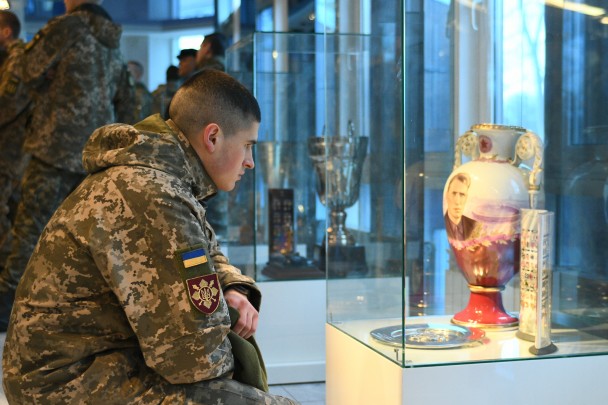 Далее следовала прогулка через знаменитую колоннаду, у которой гости остановились для коллективного фото, в музей истории "Динамо". В музее, в котором хранятся чемпионские кубки и награды "бело-синих", представители элитной воинской части имели возможность ознакомиться с историей основания клуба и достижениями команд "Динамо" разных поколений, а также просмотреть памятные фотографии выдающихся игроков киевлян.