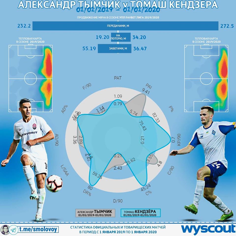Но если взять конкретно игру один в один, то успешнее будет Кендзёра: 61.49% против 53.18% выигранных дуэлей в защите у Тымчика.