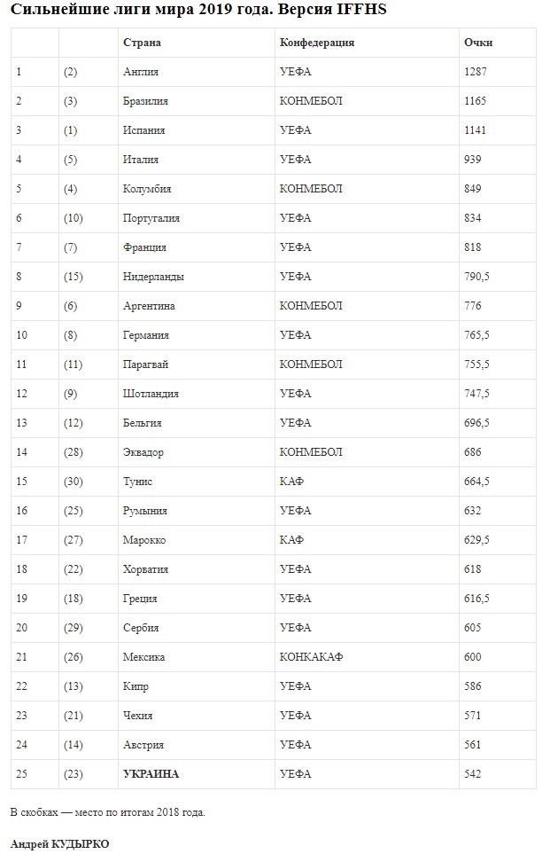 Международная федерация футбольной истории и статистики традиционно сформировала рейтинг сильнейших лиг мира по итогам года. В 2019-м на первое место у IFFHS вышла Англия, которая заменила на вершине Испанию. Пиренейцы опустились на третье место, пропустив на второе Бразилию.