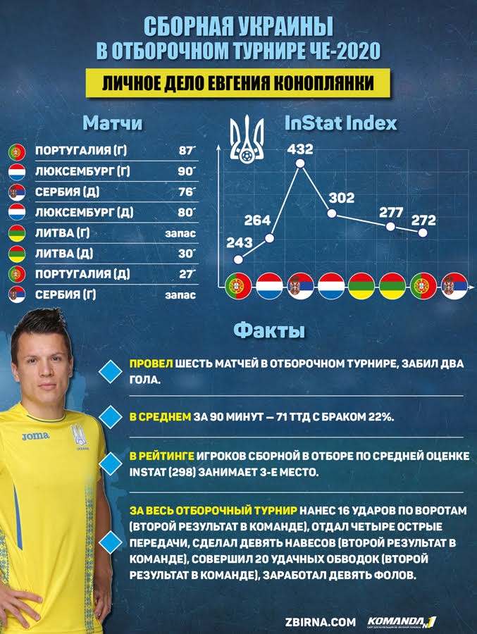 В квалификации Евро-2020 Евгений Коноплянка был одним из немногих футболистов сборной Украины, сменивших по ходу турнира клуб. Сам отбор для него, в общем-то, и разделился на две части, и первая, в качестве игрока немецкого Шальке, вышла куда убедительнее. Чего только стоит домашний поединок с Сербией с дублем одного из лучших игроков сине-желтой дружины!