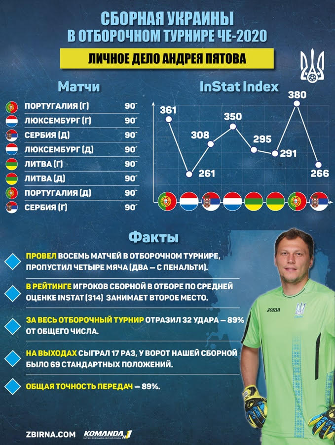 По ходу всего отборочного турнира у ворот сборной Украины было немало стандартных положений, но игра на выходах у Пятова была на хорошем уровне. Большой плюс голкипера заключается и в том, что он хорошо играет ногами — в тактике Андрея Шевченко это имеет большое значение. Доля длинных передач от общего числа пасов составила меньше 33%. Важно, что в клубе вратарь действует в таком же ключе, и у него хорошее взаимопонимание с защитниками. В итоге по рейтингу эффективности игры Андрей Пятов занял второе место в отборочном турнире среди всех футболистов сборной Украины. Лучше отыграл только полузащитник Руслан Малиновский.