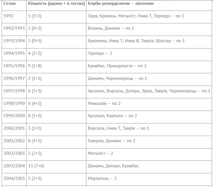 Розподіл автоголів у Чемпіонатах України по сезонах (1992-01.02.2020)