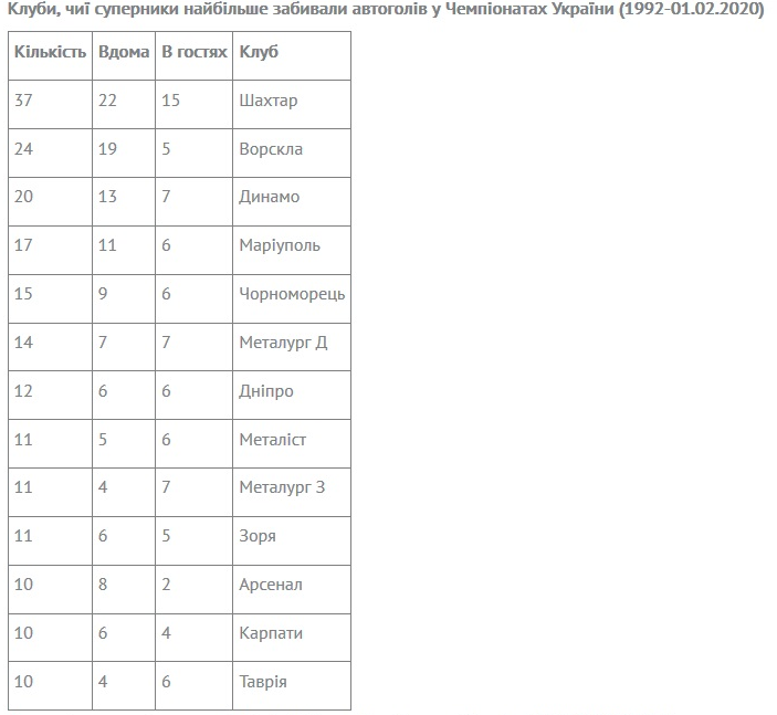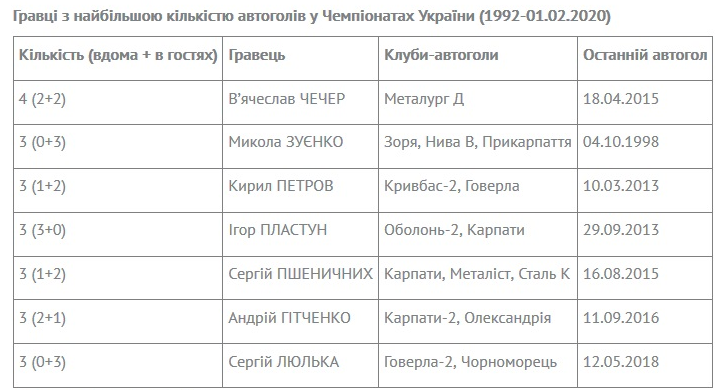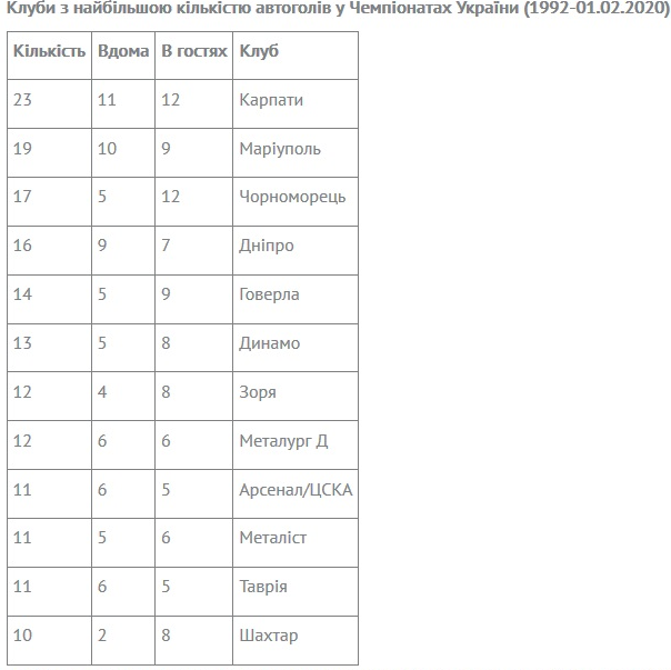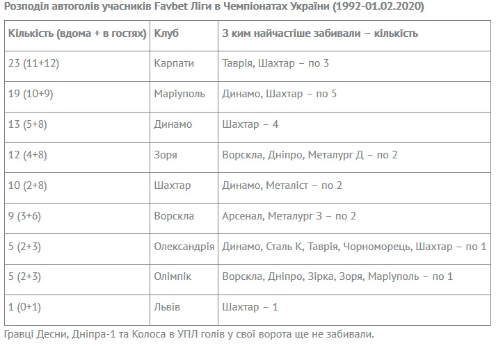 Тоді подумалося, що сезон-2019/20 стане врожайним на кількість випадків, коли гравці «зрізали» м’ячі у власні ворота. Проте в наступних 17-ти турах зафіксовано лише три «самостріли». Тож маємо наразі 5 автоголів, а для порівняння за весь минулий сезон було 14 автоголів, а в позаминулому Чемпіонаті – 10. Імовірно навесні кількість голів у власні ворота збільшиться, бо за всю історію Чемпіонатів України саме у березні-травні арбітри 94 (!) рази фіксували у протоколах голи у власні ворота.