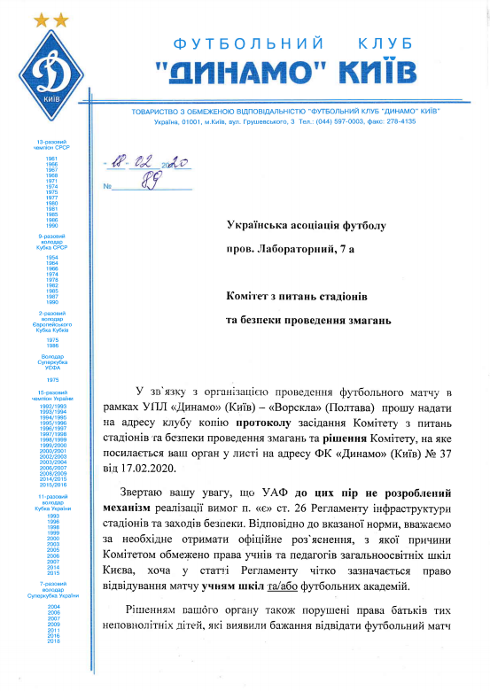 Представляем вниманию общественности письмо ФК «Динамо» Киев от 18.02.2020, адресованное УАФ.