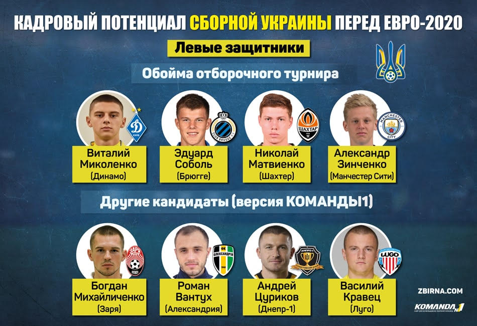 Основной левый защитник сборной Украины в отборе — Виталий Миколенко. По его игре практически не возникало вопросов, динамовец стал настоящим открытием года для национальной команды. В нескольких матчах его успешно подменял Эдуард Соболь, который показывает высокий уровень игры в Брюгге. Не стоит забывать и о том, что до побега из сборной Ярослава Ракицкого на этом месте уверенно действовал Николай Матвиенко, а в Манчестер Сити позицию левого защитника закрывает Александр Зинченко. Смещать этих исполнителей со своих мест, конечно же, не стоит (в этом нет никакой необходимости), но все это к тому, что попасть на чемпионат Европы другим игрокам данного амплуа будет непросто. В случае какого-то форс-мажора тренеры найдут выход из ситуации за счет внутренних резервов, а брать в заявку трех чистых левых защитников точно не имеет смысла.