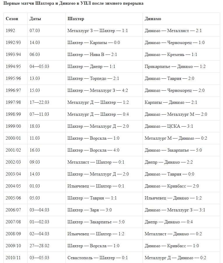 Шахтер в этих 29-ти встречах добыл 24 победы при пяти ничьих. При этом горняки выиграли восемь последних стартовых матчей второй половины сезона. У Динамо также 24 виктории, но есть одно поражение и четыре ничьи. Действующая выигрышная серия бело-синих насчитывает семь поединков. В 19-ти сезонах из 29-ти Шахтер и Динамо синхронно побеждали в первом матче.