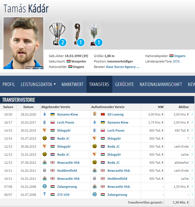Китайский "Шаньдун Лунэн" заплатил "Динамо" за защитника Тамаша Кадара 3 млн евро.