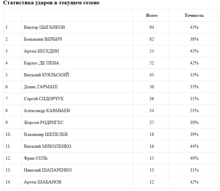 Примечание. Приведена статистика игроков, которые нанесли не меньше 10-ти ударов.