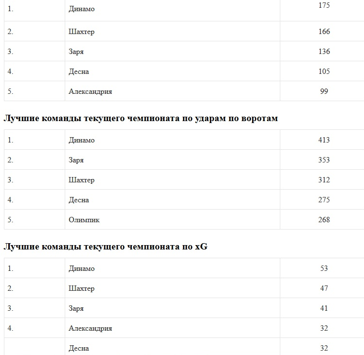 Глядя на статистику ключевых показателей игры в атаке, сложно понять, как Динамо могло отстать от Шахтера в этом чемпионате на 14 очков (даже несмотря на огромную пропасть между командами в организации игры). Киевляне опережают горняков и по голевым моментам, и по числу ударов по воротам, и по вероятности взятия ворот, но все упирается в реализацию. Теперь остается только разобраться, в чем именно дело — в мастерстве, в психологии или в чем-то еще. Правда, в футболе никто не отменял такого понятия, как везение, ведь динамовцы нанесли в нынешнем сезон УПЛ уже 14 ударов в каркас ворот. Второе место делят Десна и Мариуполь, у которых по семь выстрелов в штанги и перекладины.