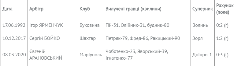 Арбітри, які 3 рази за матч вилучали з поля гравців одного клубу в Чемпіонатах України (1992 – 08.03.2020)