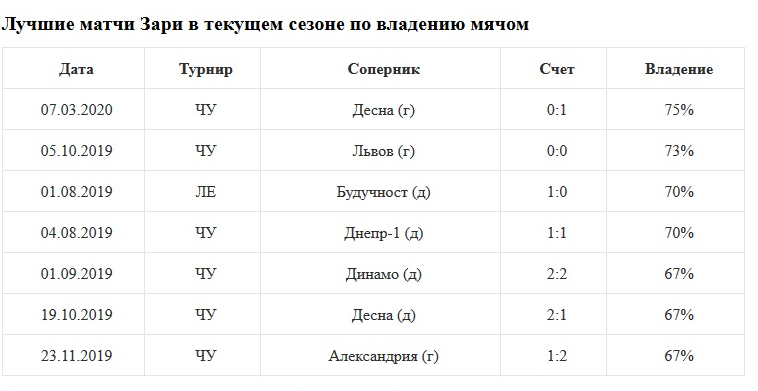 В матче с Десной футболисты Зари установили новый рекорд сезона по владению мячом (75%), но это не помогло команде Виктора Скрипника сыграть хотя бы вничью. В семи случаях, когда луганчане контролировали ситуацию на поле минимум две трети времени, они одержали лишь две натужные победы. К слову, средний показатель по сезону — 61%.