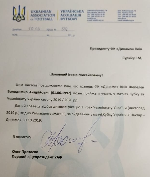 УАФ в официальном письме подтвердила статус Владимира Шепелева, как игрока, который имеет право принять участие в матче против «Александрии».