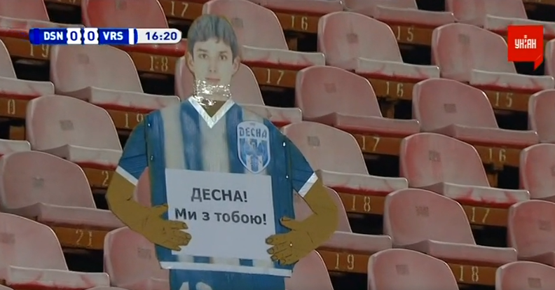 Кроме того, на трибунах стадиона имени Юрия Гагарина установили картонного болельщика с надписью "Десна! Ми з тобою!", что показали в эфире канала "УНІАН".
