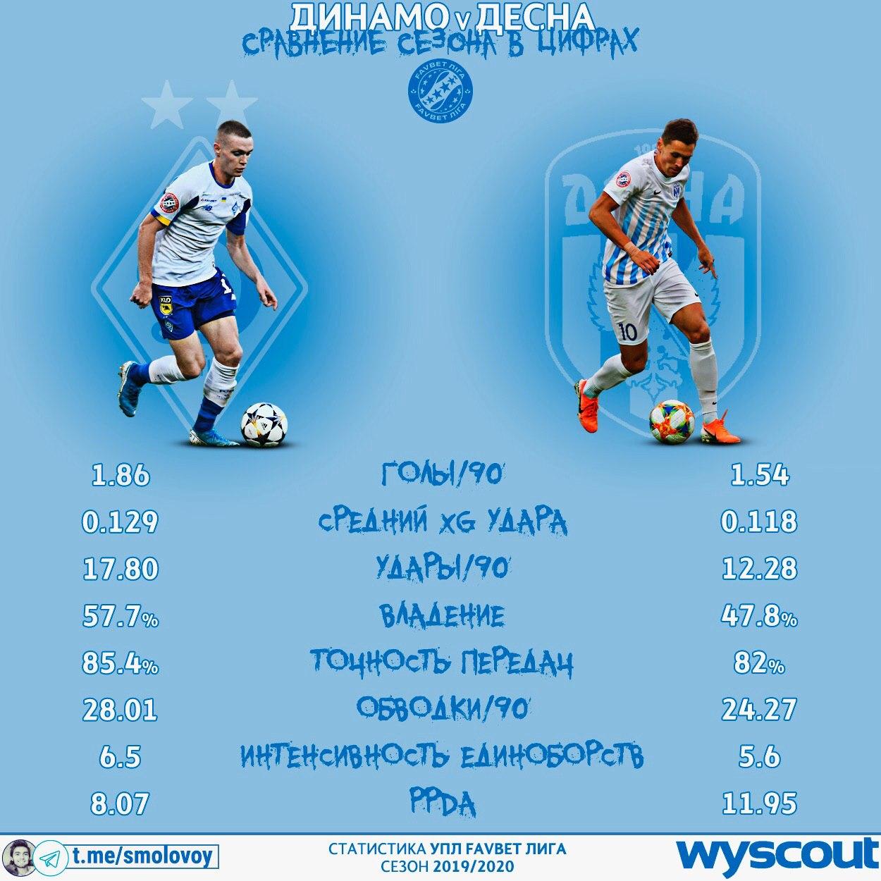 В матче 15 декабря 2019, когда Динамо отдавало мяч в концовке, имели владение более 64%. За эти 20 минут провели 7 позиционных атак, но удар был лишь 1 (Хлёбас, 84’, 0.19 xG). Его благополучно заблокировали. Десна заканчивала игру со скоростью в 15.63 передачи, что где-то между ужасно и плохо.
