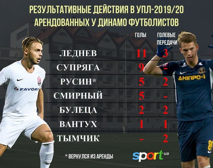 В нынешнем сезоне в клубах УПЛ начинало сезон девять арендованных игроков «Динамо». В сумме эти игроки в матчах чемпионата забили 33 мяча. Больше других забили хавбек «Зари» Богдан Леднев и нападающий «Днепра-1» Владислав Супряга. На счету Леднева 11 голов, у Супряги – 9 и три из них в рамках 20-го тура форвард провел именно в ворота «Динамо».