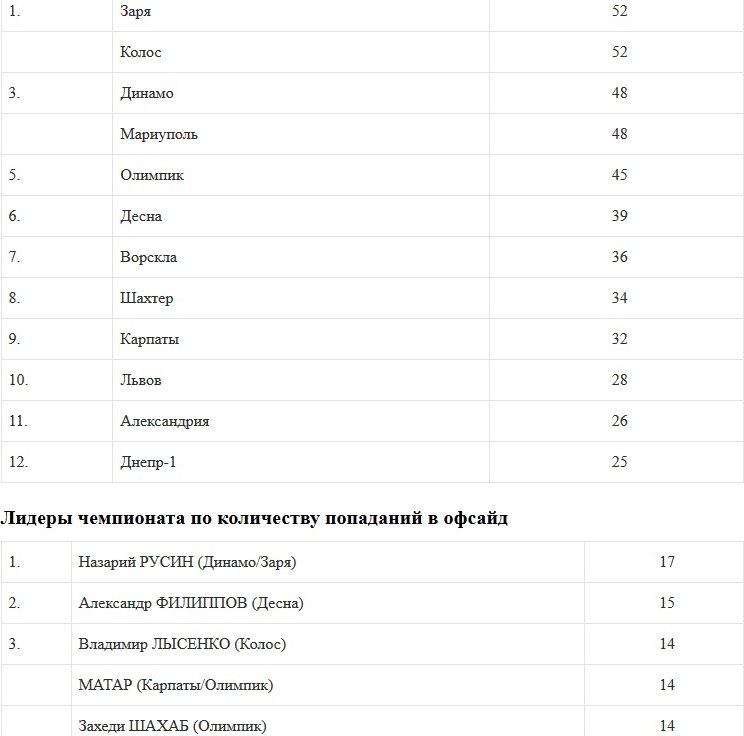 В текущем чемпионате Украины в среднем за игру фиксируется по 3,3 офсайда. Это не так много. В ведущих европейских лигах данный показатель выше, а он во многом подчеркивает не только внимательность исполнителей, отдающих пас, но и специфику игры нападающих. Кто-то все время отскакивает, обыгрывается с партнерами и набирает ТТД, а кто-то бежит за спины защитникам, пытается получить мяч в ударных позициях. Примерно в таком ключе играют форварды Зари и Колоса, хотя у команды Руслана Костышина откровенный вертикальный футбол. В индивидуальном зачете лидирует бывший нападающий Зари, а ныне форвард Динамо — Назарий Русин. На втором месте — тоже хорошо умеющий играть на грани офсайда Александр Филиппов из Десны.