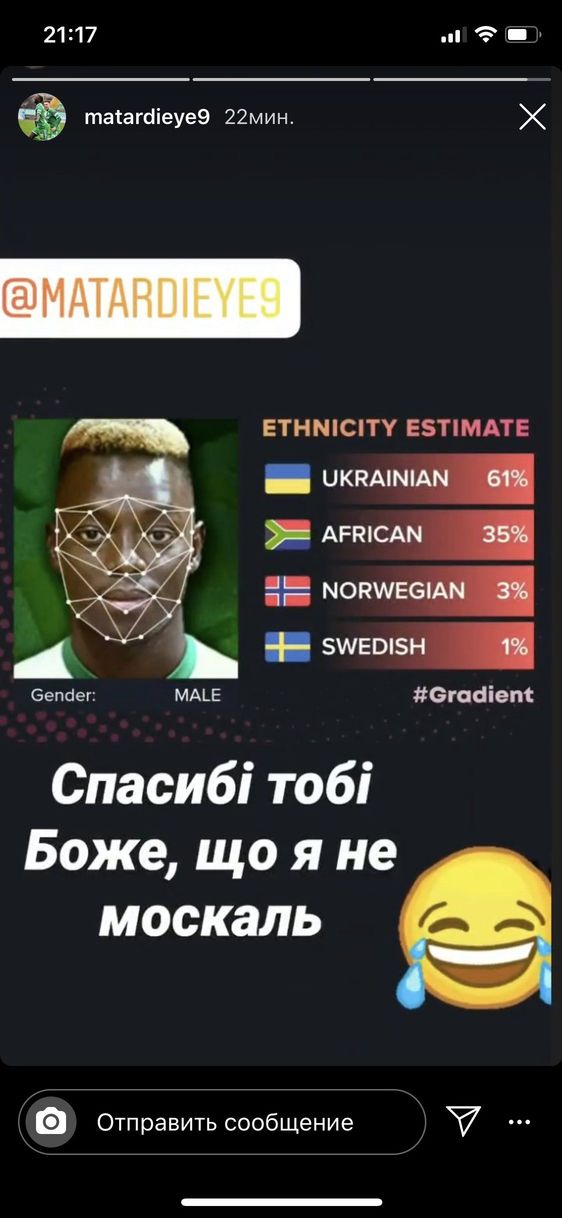 Нападающий львовских "Карпат" Матар Дийе во время карантина воспользовался популярным мобильным приложением Gradient, которое определяет национальность по лицу человека на фото.
