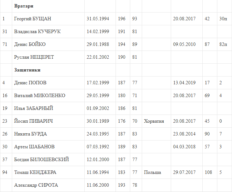 Указаны номер футболиста, дата рождения, рост и вес (данные УПЛ), страна (для легионеров), дата дебюта за первую команду Динамо в официальном матче, суммарное количество игр и голов за первую команду Динамо во всех официальных турнирах (чемпионат, Кубок и Суперкубок Украины, еврокубки).