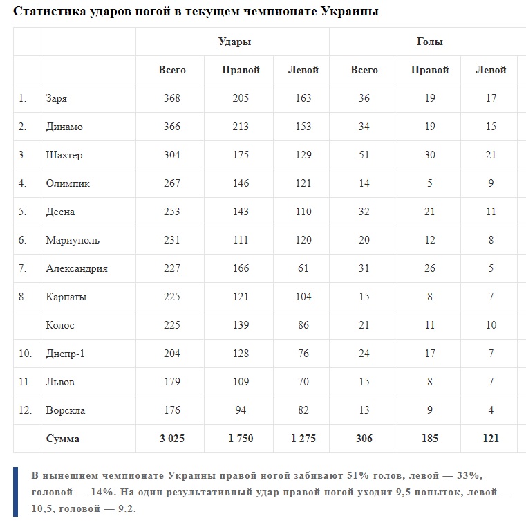 Zbirna.com проанализировала, как в УПЛ забивают мячи головой, отметив, что в этом деле лучше всех пока ориентируются футболисты Динамо. Зато ногами они забили меньше не только Шахтера, но и Зари. При этом у киевлян примерно равное соотношение результативных ударов правой и левой. Такая же ситуация и в Заре. Вообще, в нынешнем чемпионате правой забивают в полтора раза больше, чем левой. Олимпик — единственный клуб, у футболистов которого левая нога приносит больше пользы, чем правая.