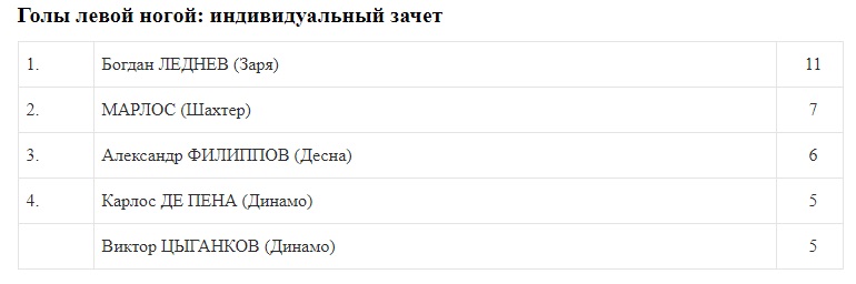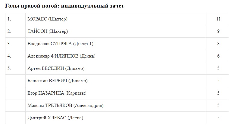 Больше всего мячей правой ногой забил нападающий Шахтера Мораес, который на первом месте в лиге и по числу голов со второго этажа. Лучший левша — полузащитник Зари Богдан Леднев. В этом чемпионате он лидирует по общему количеству ударов по воротам, при этом 75 из 80-ти выстрелов воспитанник Динамо произвел свой рабочей ногой. У форварда Десны Александра Филиппова, пожалуй, самые сбалансированные показатели: шесть голов он забил правой ногой (23 удара), шесть головой — левой (20 ударов).
