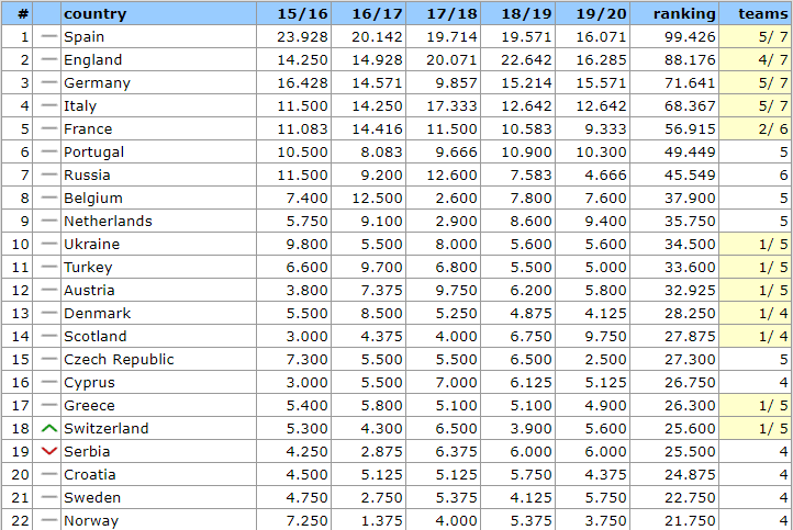 Представництво сезону-2021/22 формується за підсумками цьогорічних розіграшів турнірів. Україна поки що утримує 10-ту позицію, яка означає, що чемпіон отримає пряму перепустку у групу ЛЧ. При цьому наша асоціація все ще може наздогнати Нідерланди. Але може і пропустити Туреччину.
